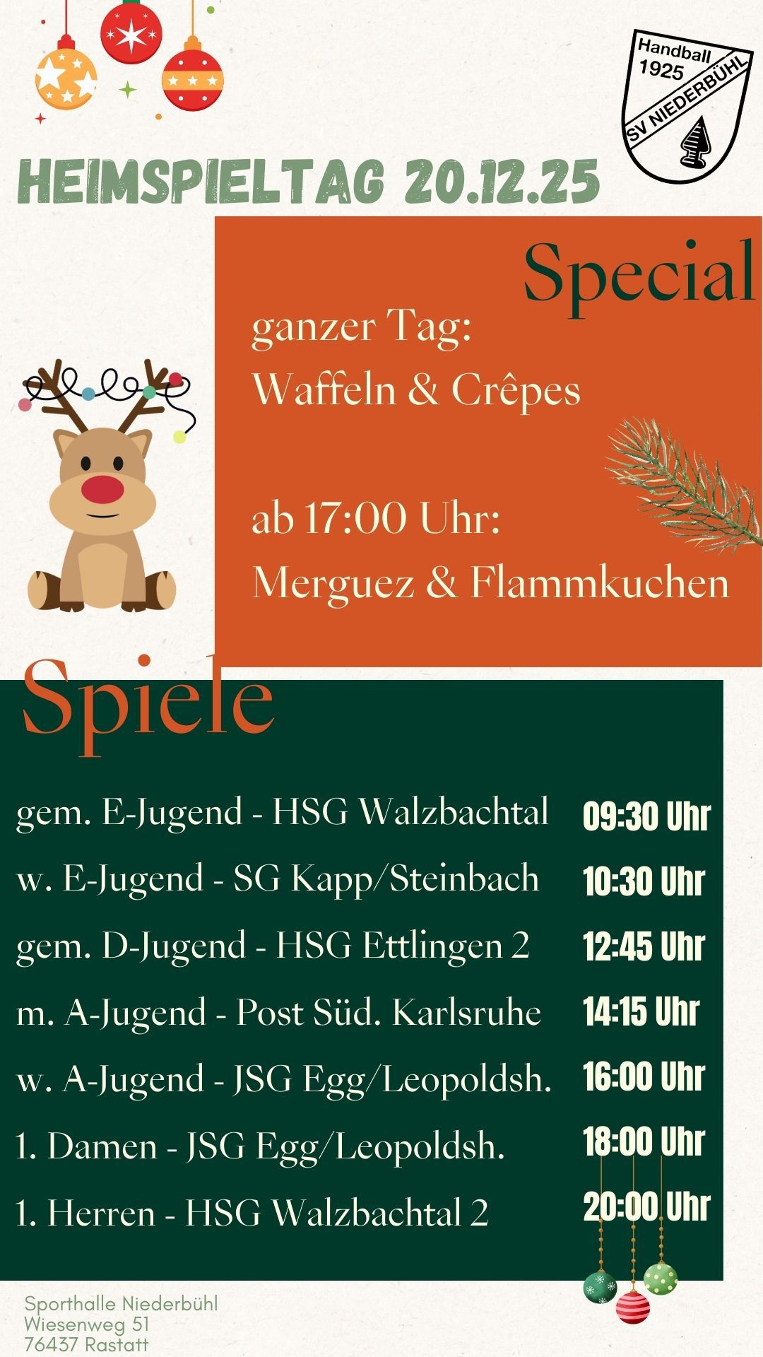 Info: Zum letzten Heimspieltag dieses Jahres wird unseren Fans, Zuschauer und Gästen einiges geboten. Den ganzen Tag über wird es selbstgemachte Waffeln und Crepes geben, ab 17 Uhr wird der Grill und der Ofen angeschmissen und es gibt leckere Flammkuchen und Merquez. Wir hoffen auf zahlreiche Unterstützung unserer Mannschaften und freuen uns, wenn viele Fans und Zuschauer den letzten Handballabend in diesem Jahr zu einem besonderen machen werden.